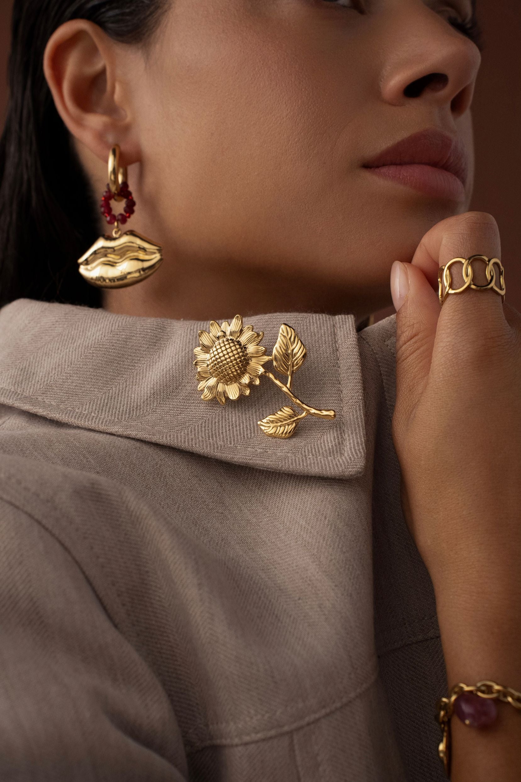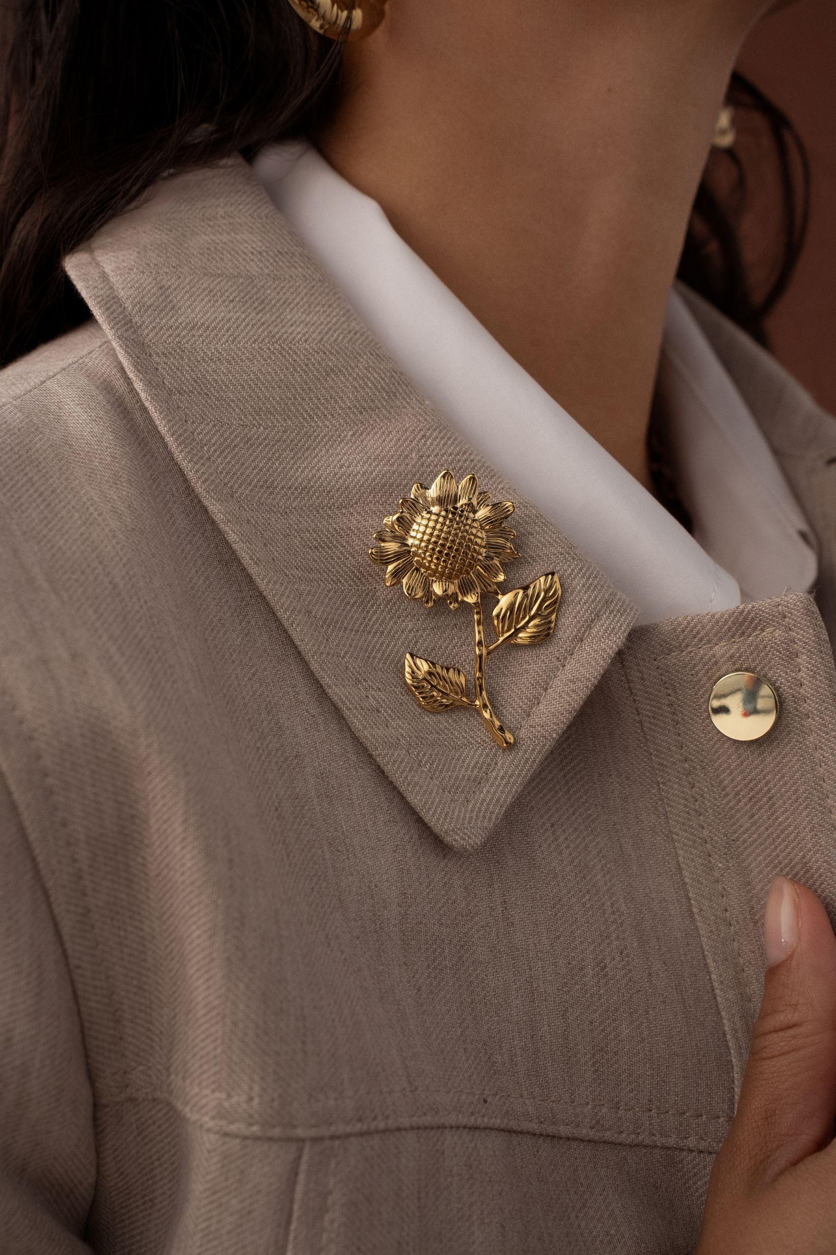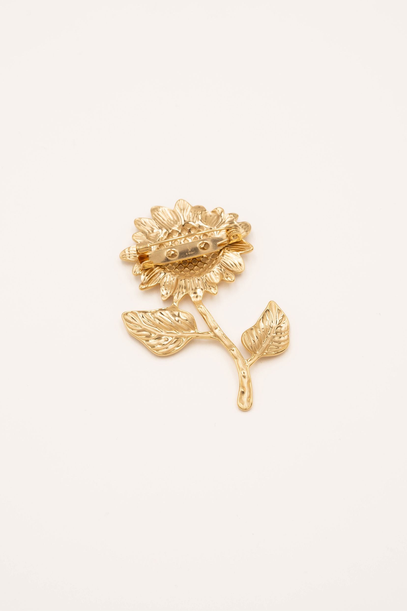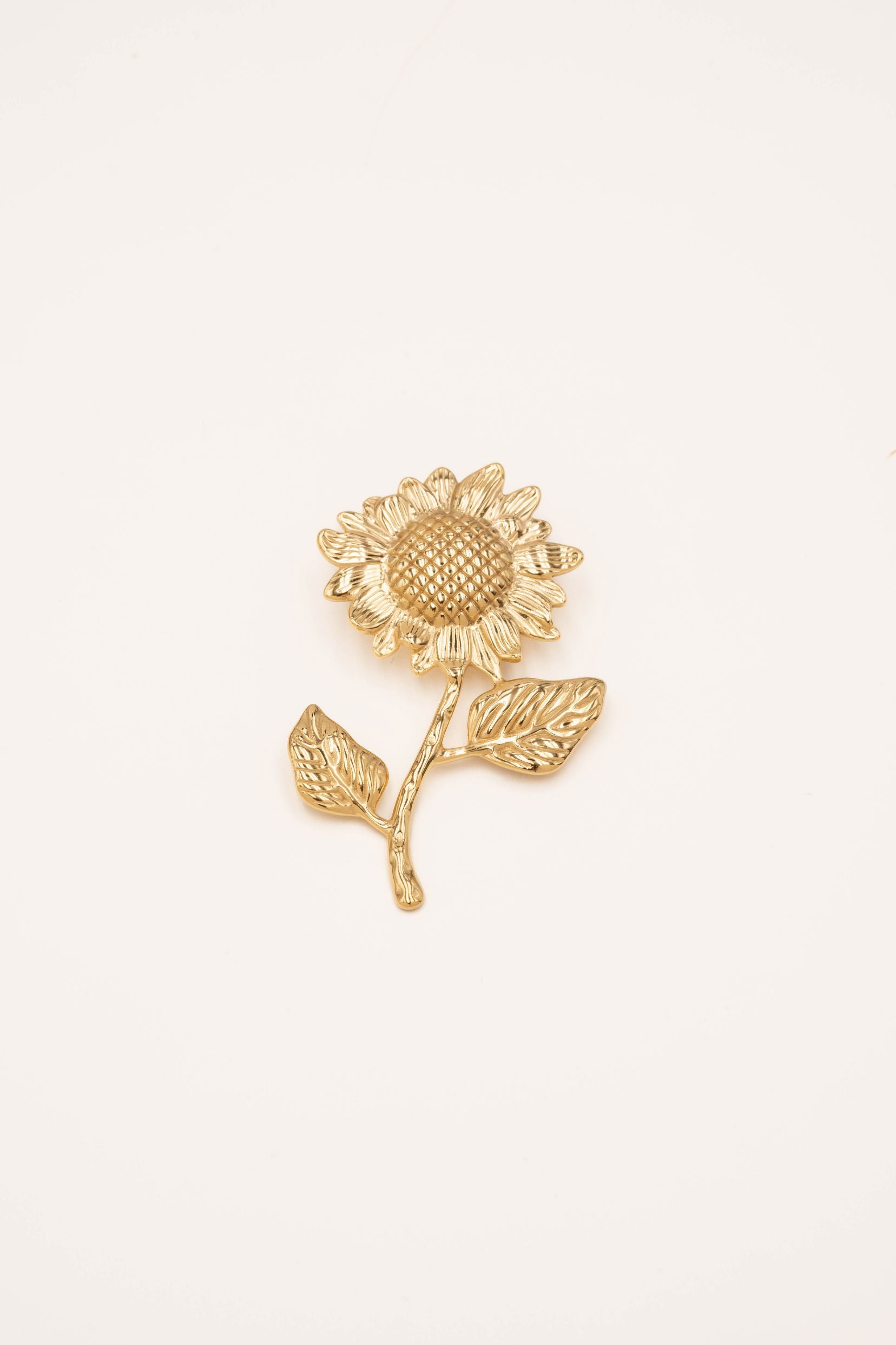 Broche en acier inoxydable composé d'un motif fleur de tournesol.