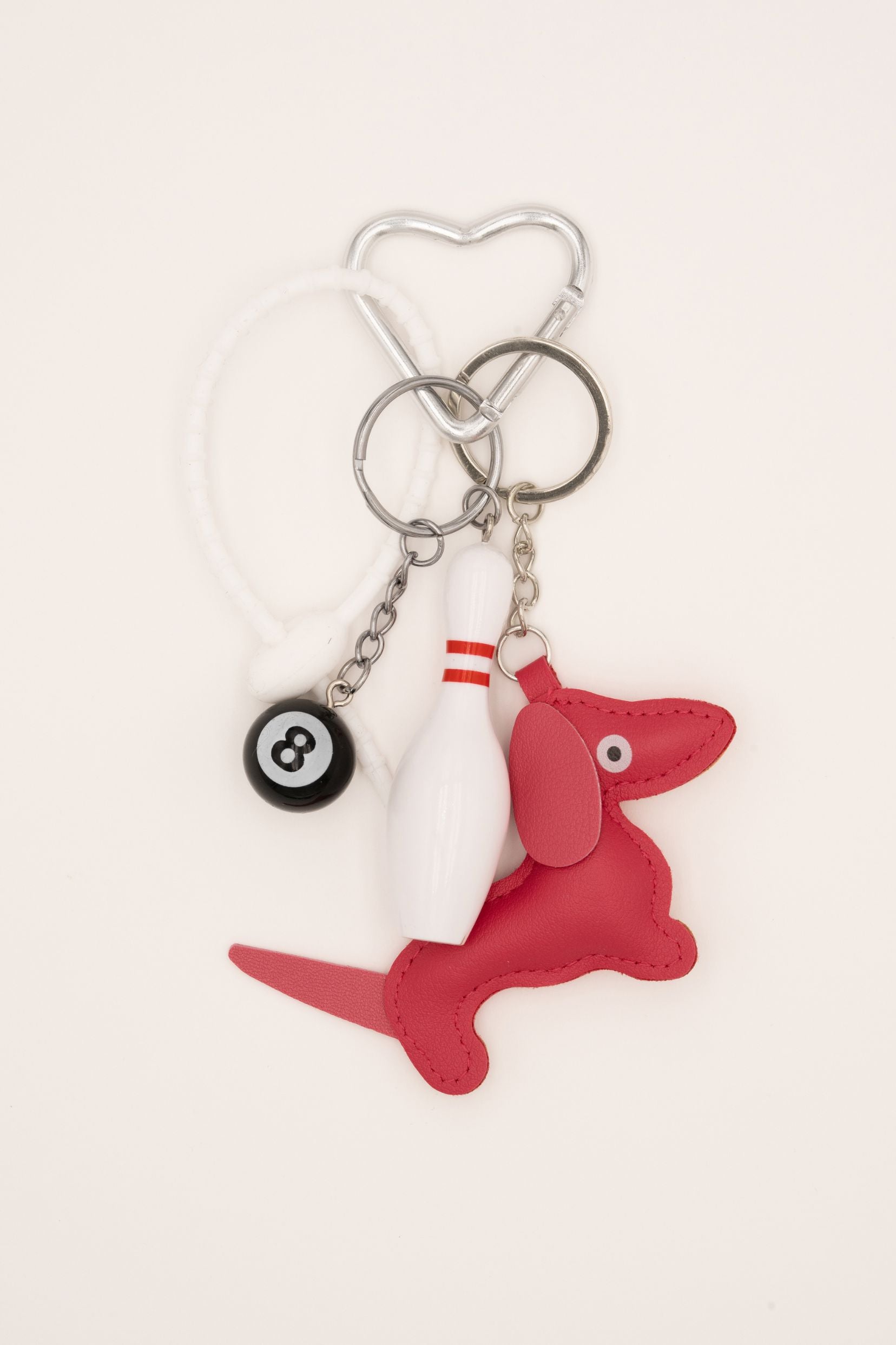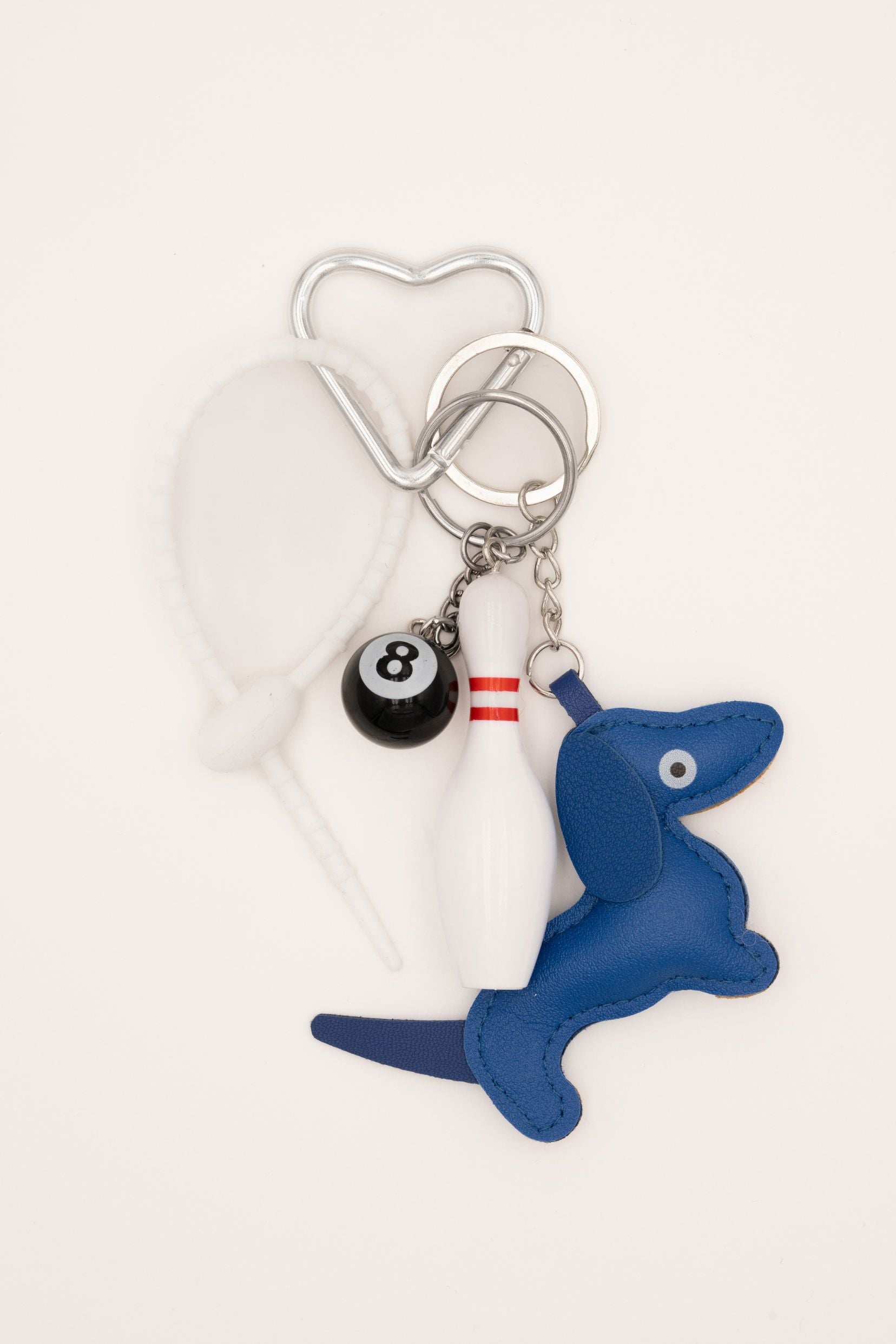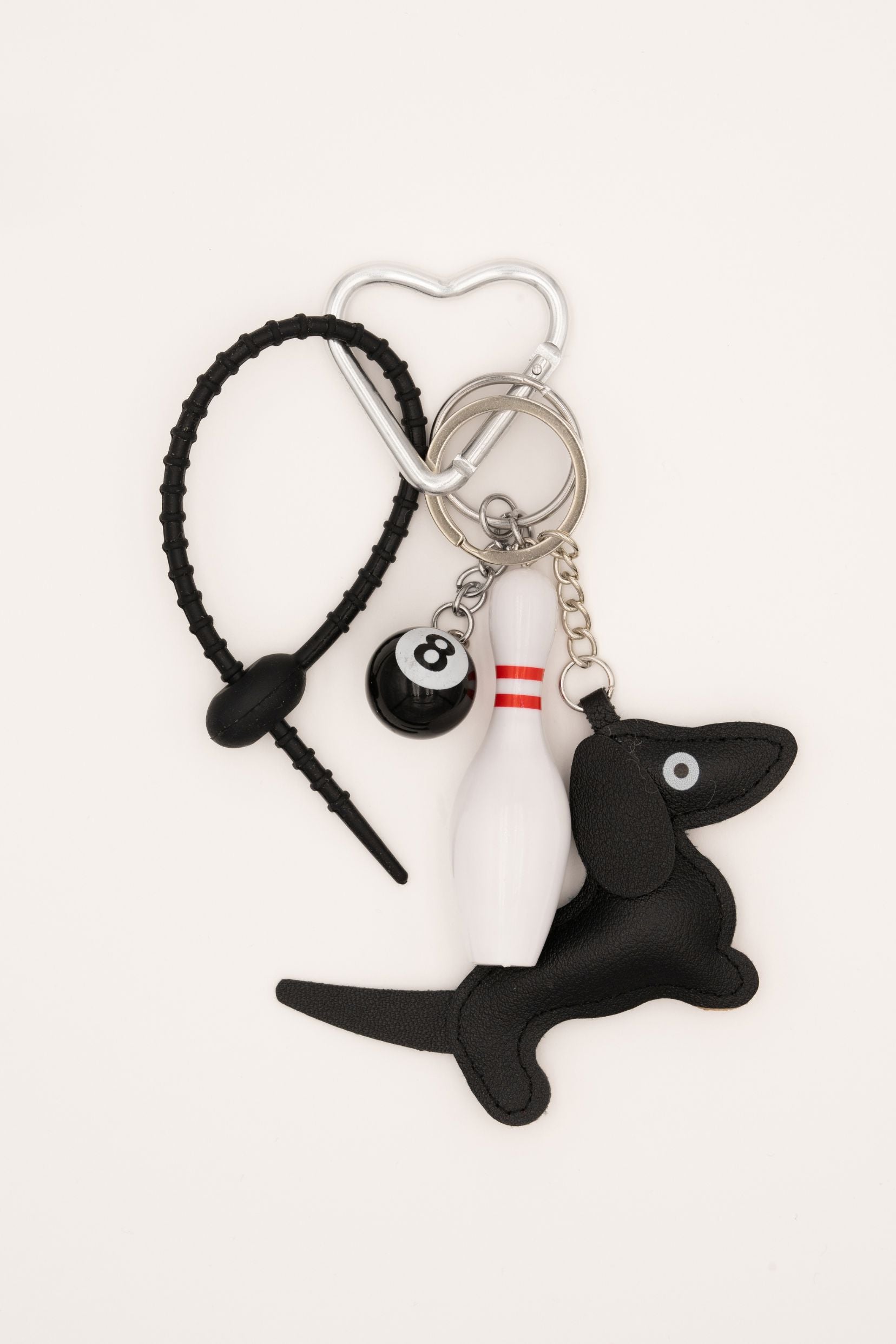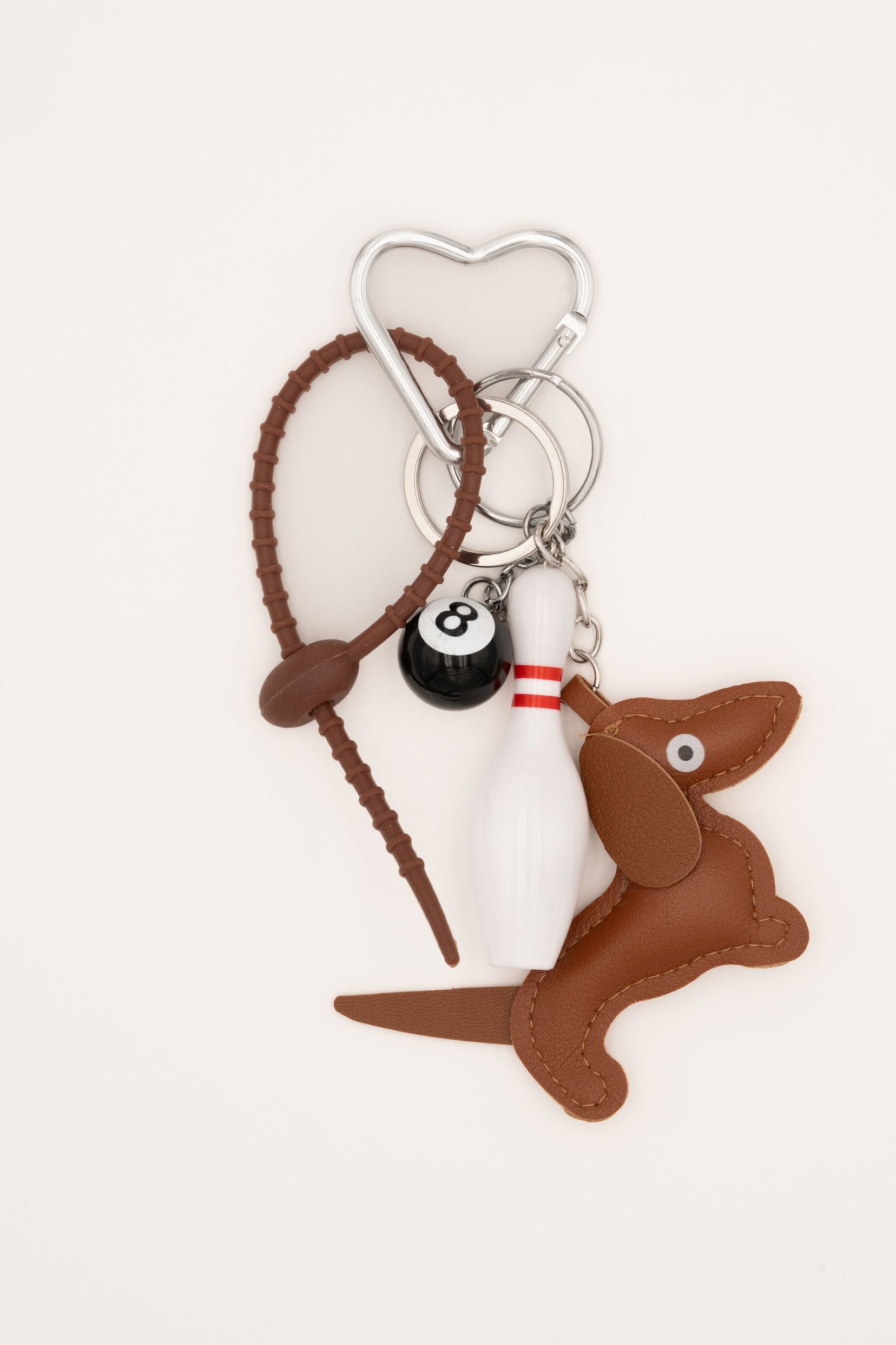Grigri composé d'une attache de sécurité en caoutchouc, d'un teckel, d'une boule de billard et d'une quille de bowling. A offrir ou à s'offrir.