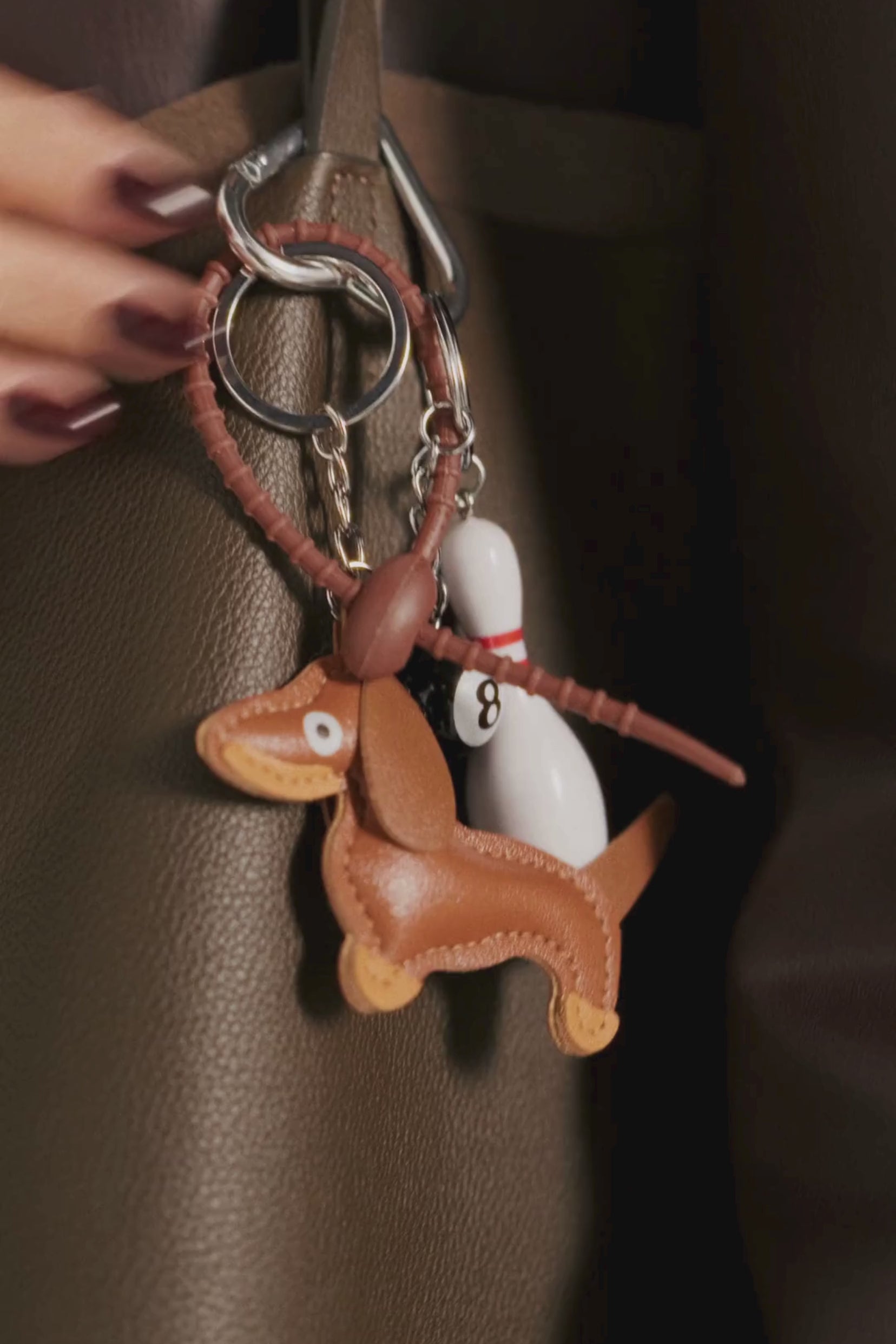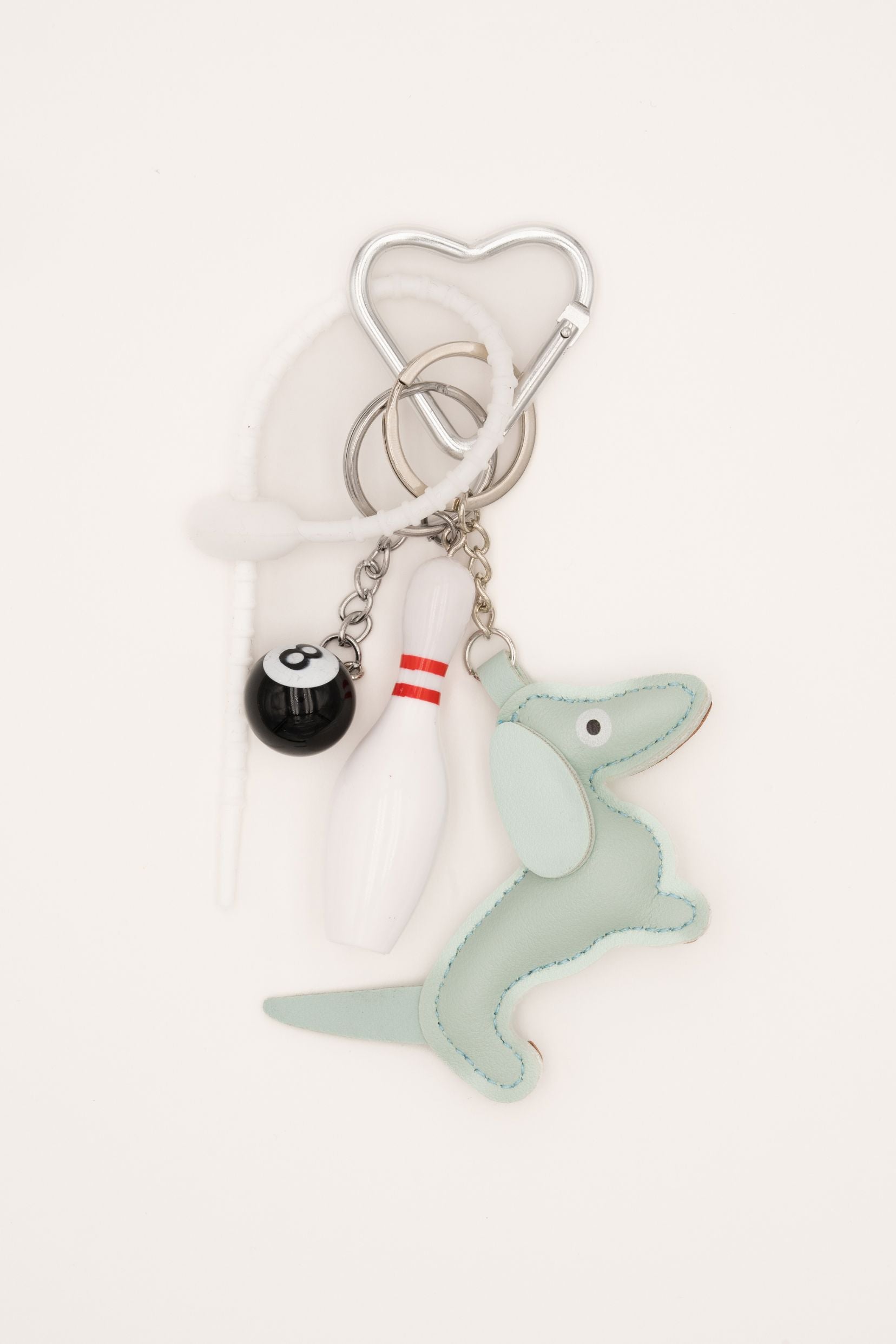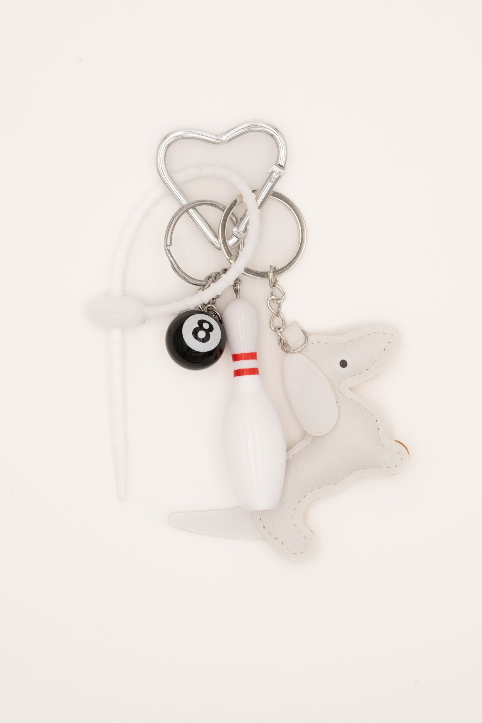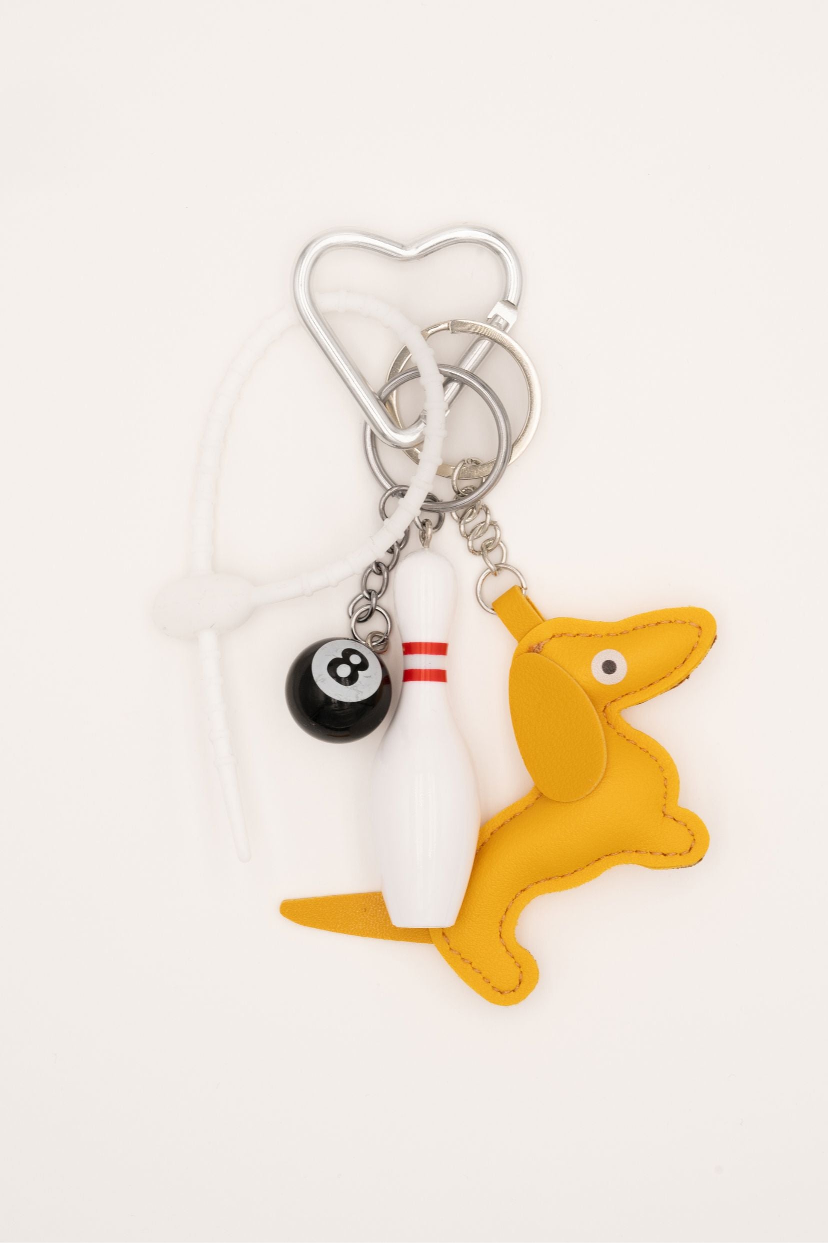 Grigri composé d'une attache de sécurité en caoutchouc, d'un teckel, d'une boule de billard et d'une quille de bowling. A offrir ou à s'offrir.