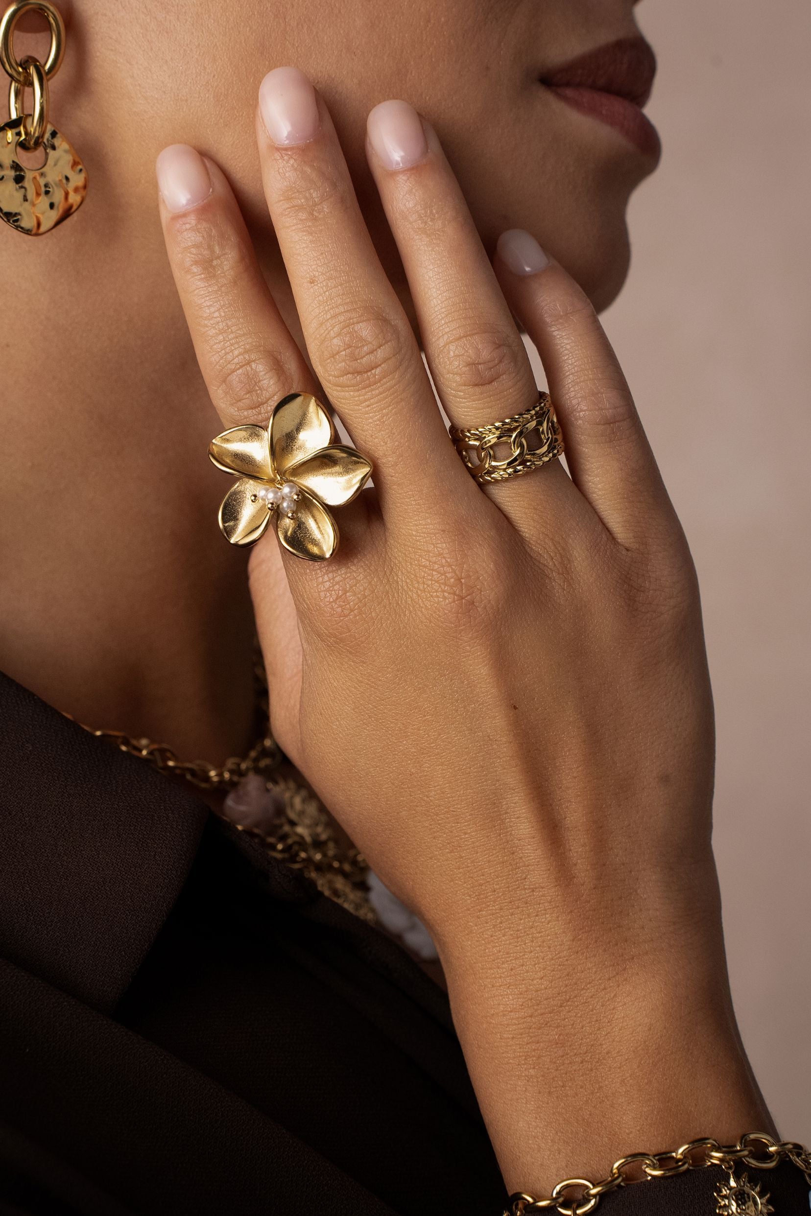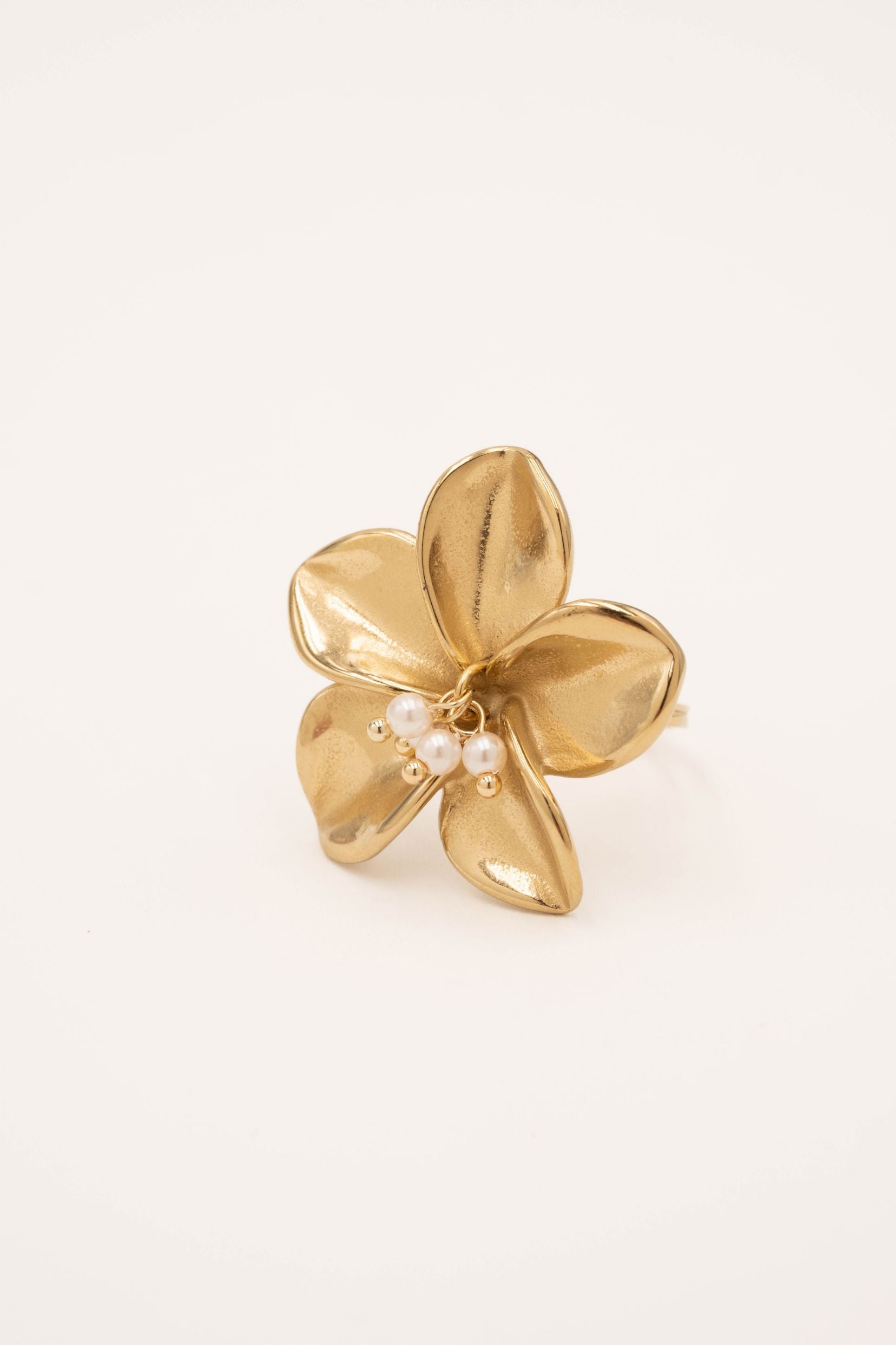 Bague en acier inoxydable composée d'une fleur et de petites perles de résine blanche.
