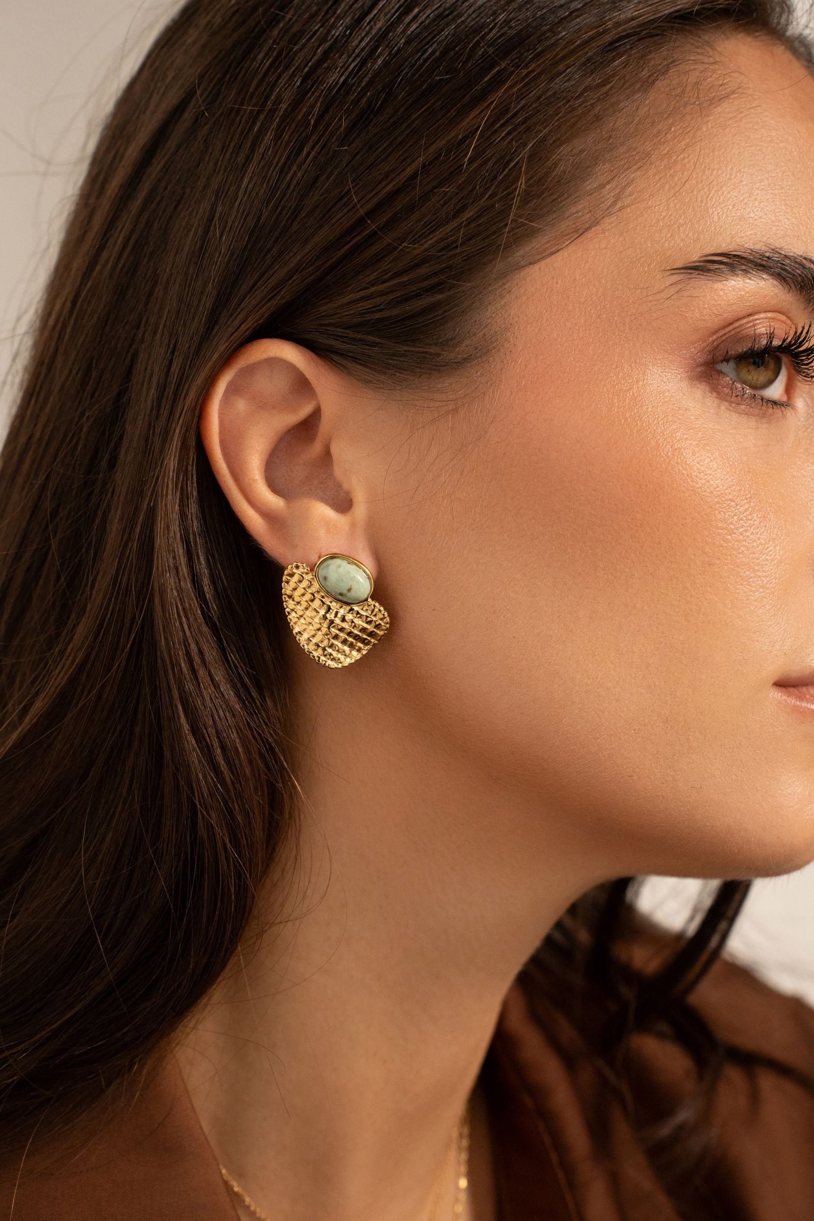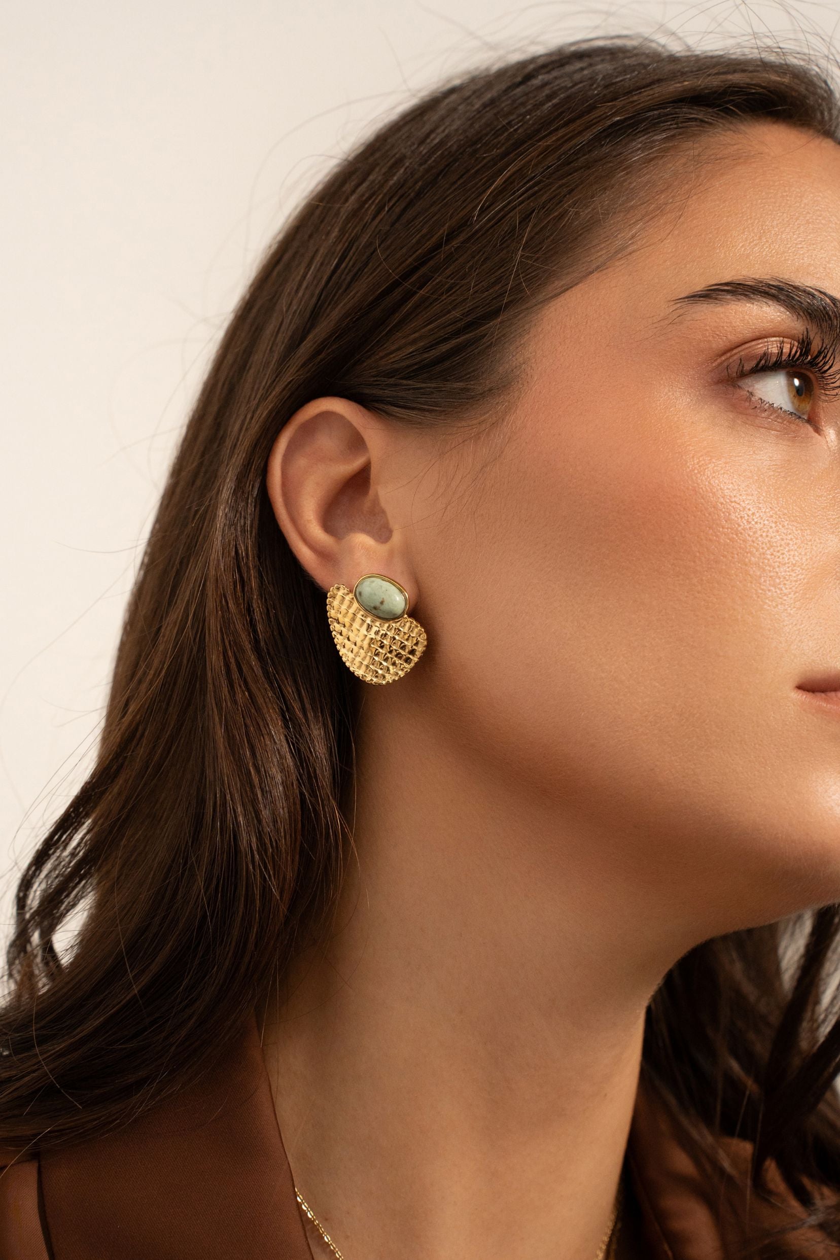 Boucles d'oreilles à puce en acier inoxydable composées d'un cabochon ovale en pierre naturelle sur une pièce effet quadrillée.