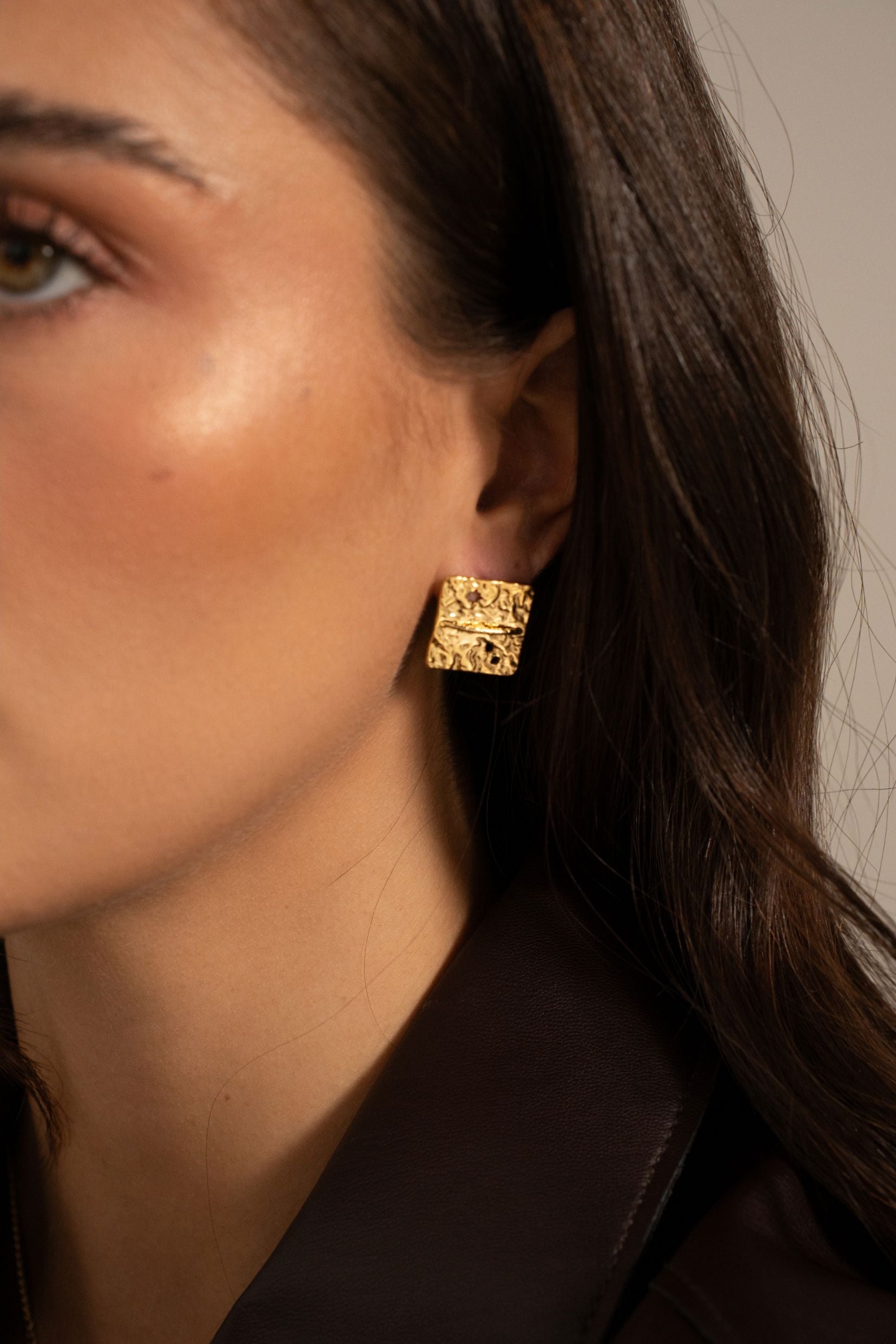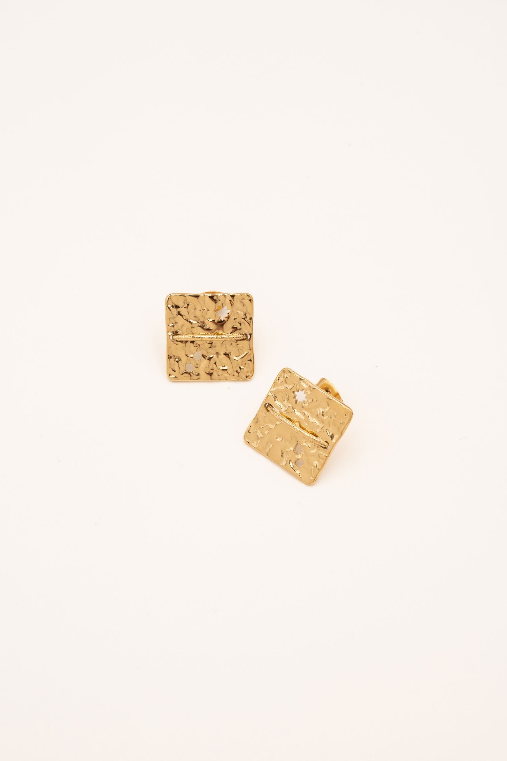 Boucles d'oreilles puces en acier inoxydable composées d'une chaîne traversant non coulissante un carré martelé.