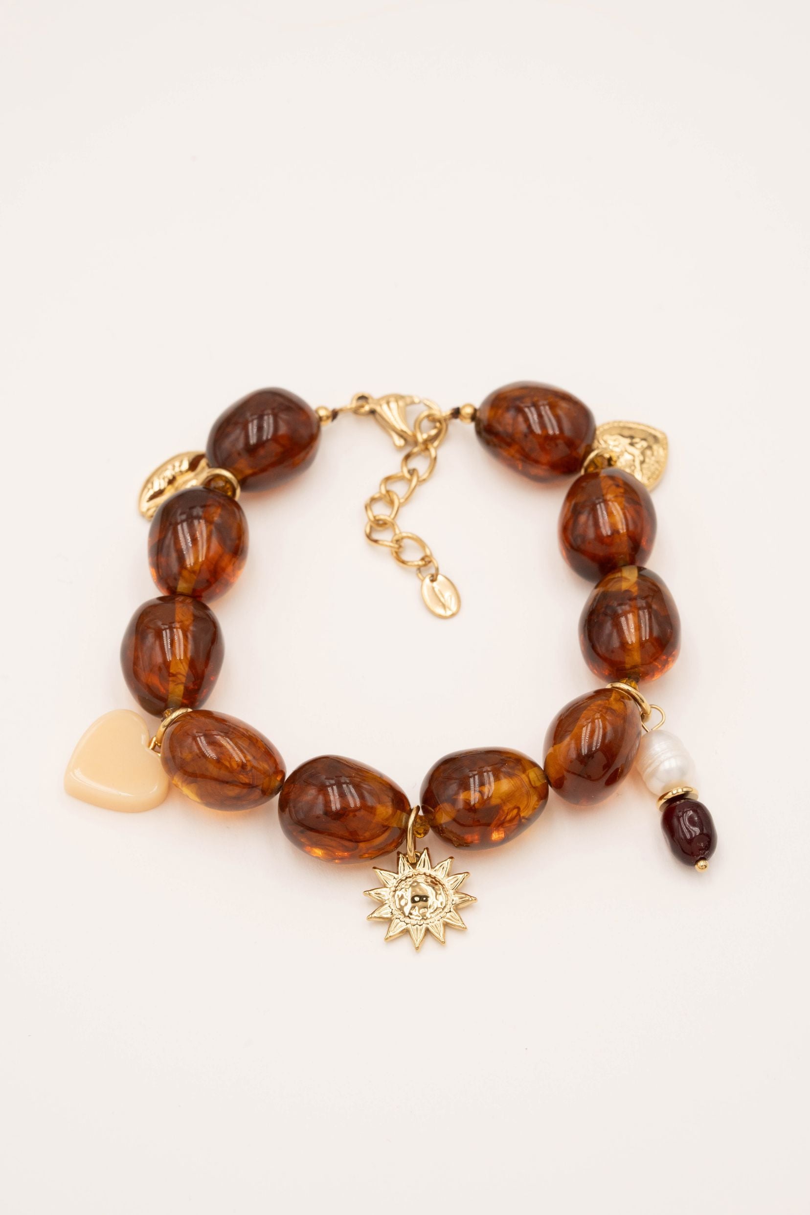 Bracelet sur fil composé de perles en résine et de pampilles en acier inoxydable (coeur, perles de résine, soleil, coeur en résine et bouche).