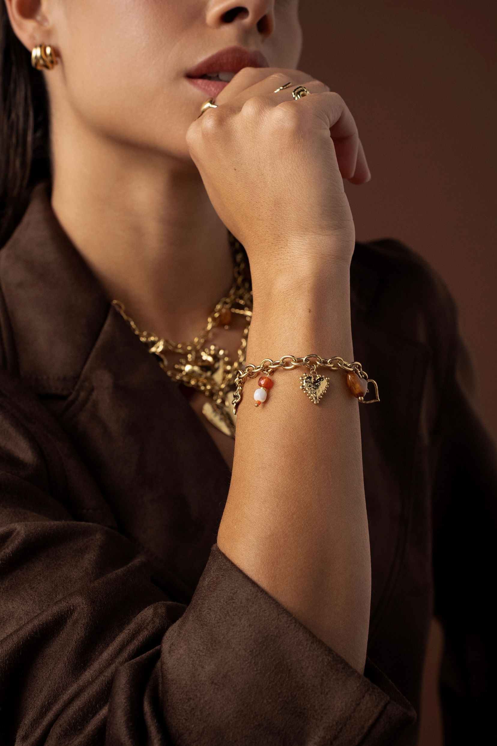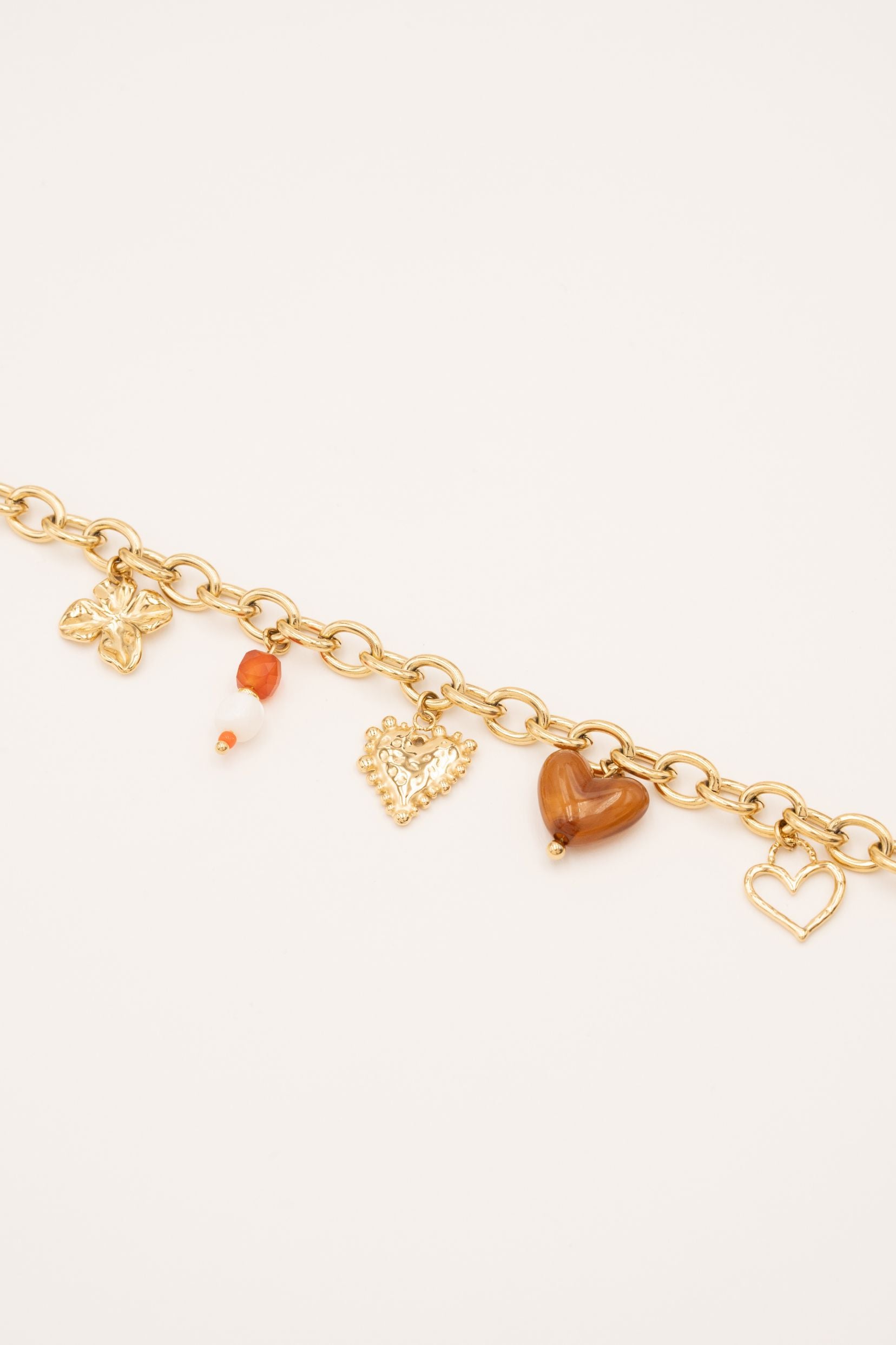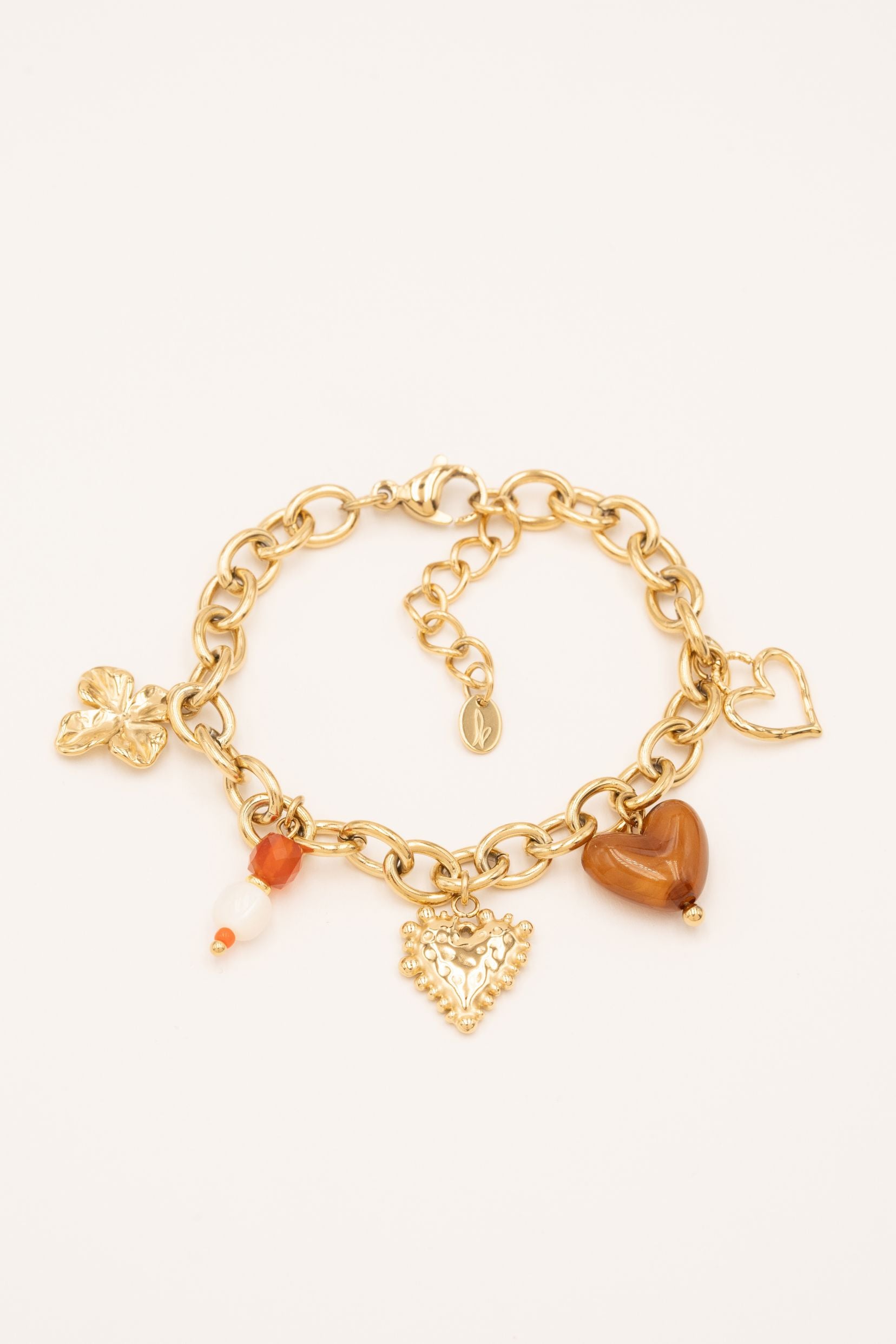 Bracelet sur chaîne en acier inoxydable composé de divers pendentifs (coeurs, trèfle, perles).