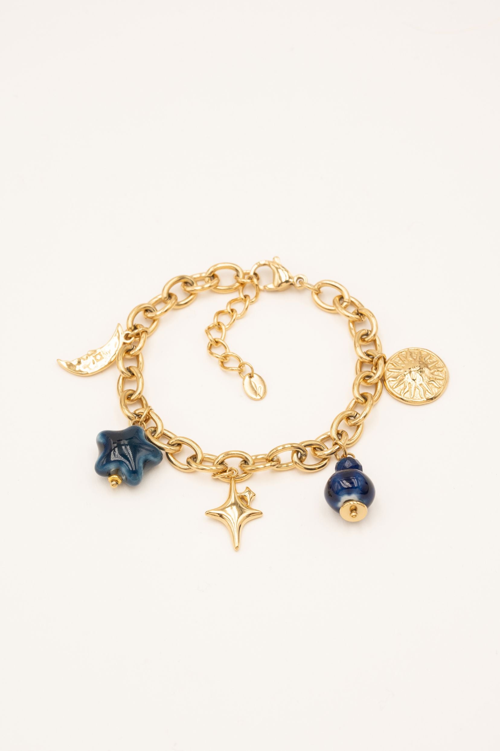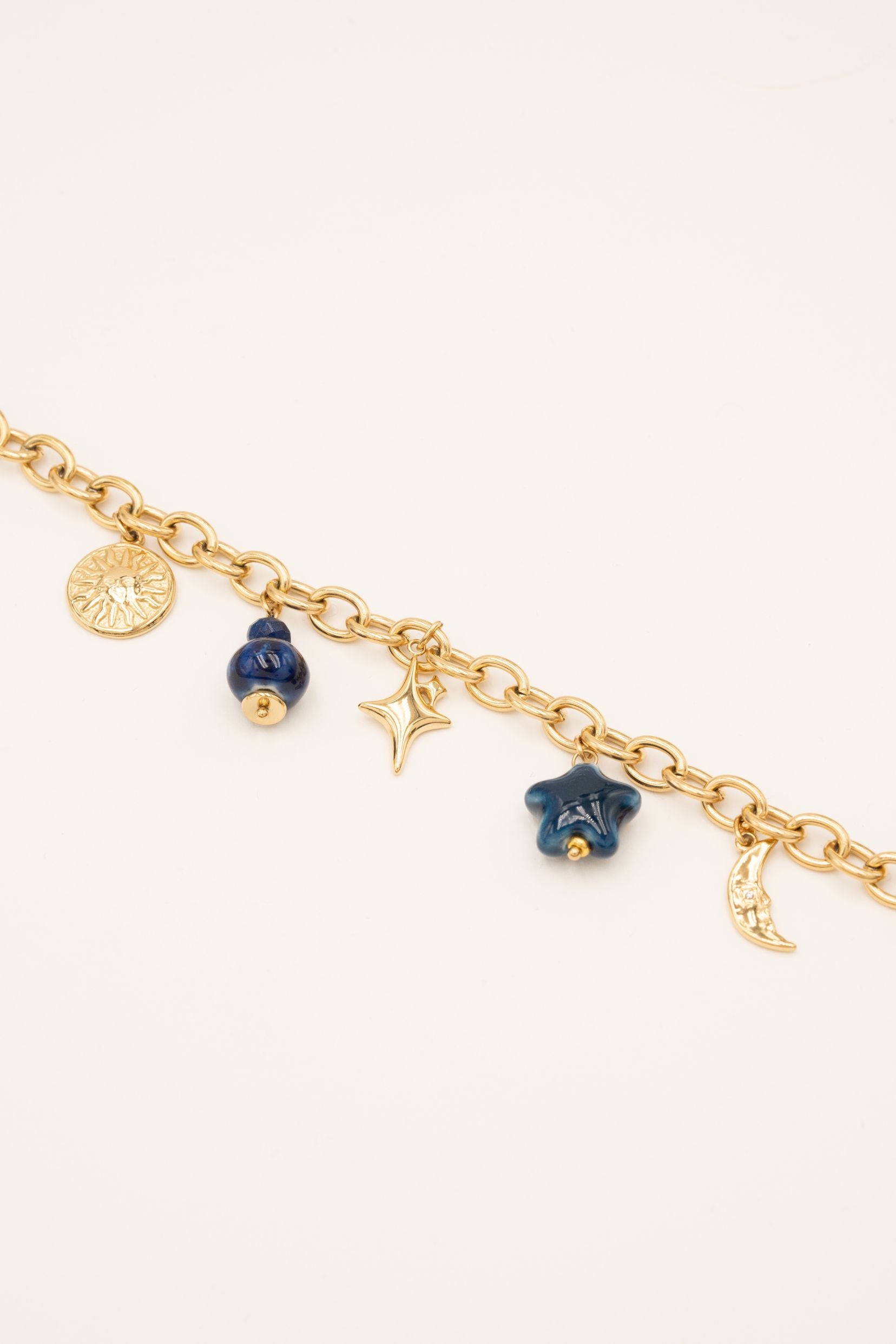 Bracelet sur chaîne en acier inoxydable composé de divers pendentifs (soleil, perles, lune, étoile et trèfle).