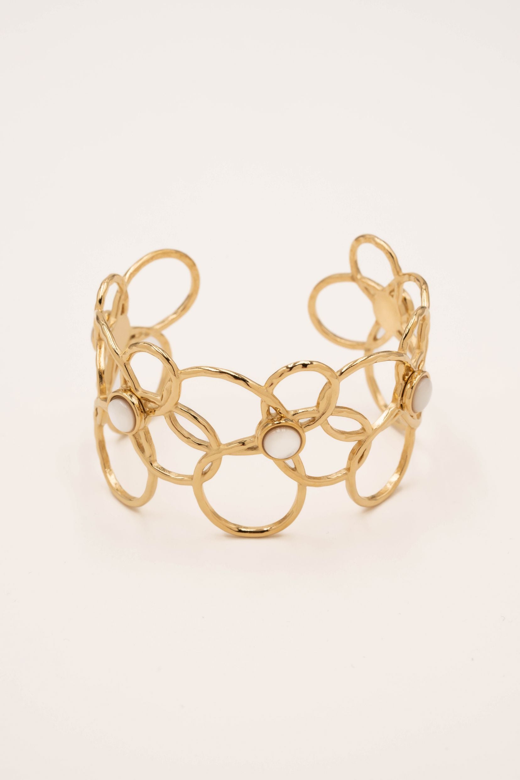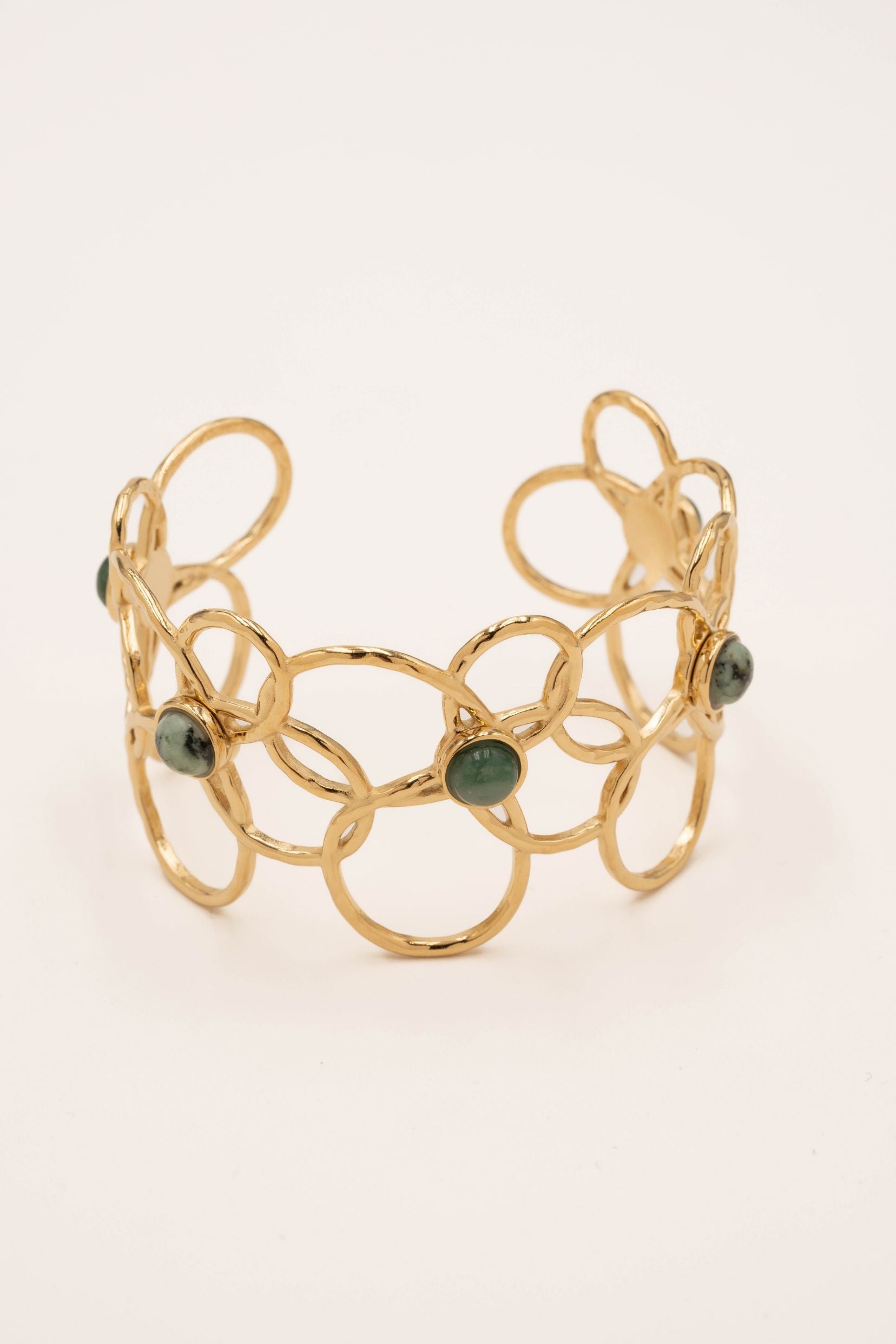 Bracelet type manchette en acier inoxydable composé de 3 motifs floraux ajourés et de pierres naturelles.