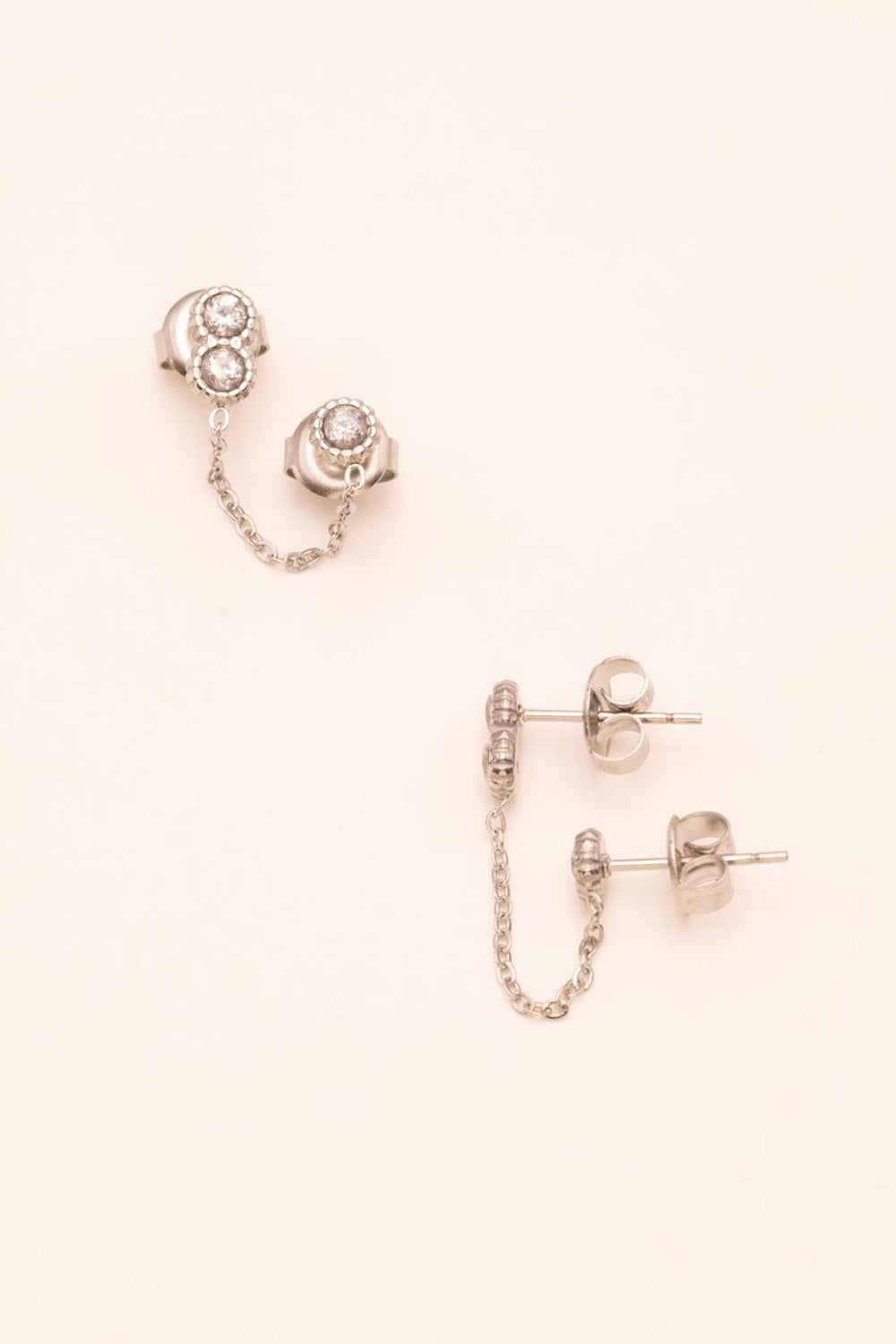 Boucles d'oreilles puces en acier inoxydable composées d'une chaîne reliant deux oxydes de zirconium à un oxyde de zirconium.