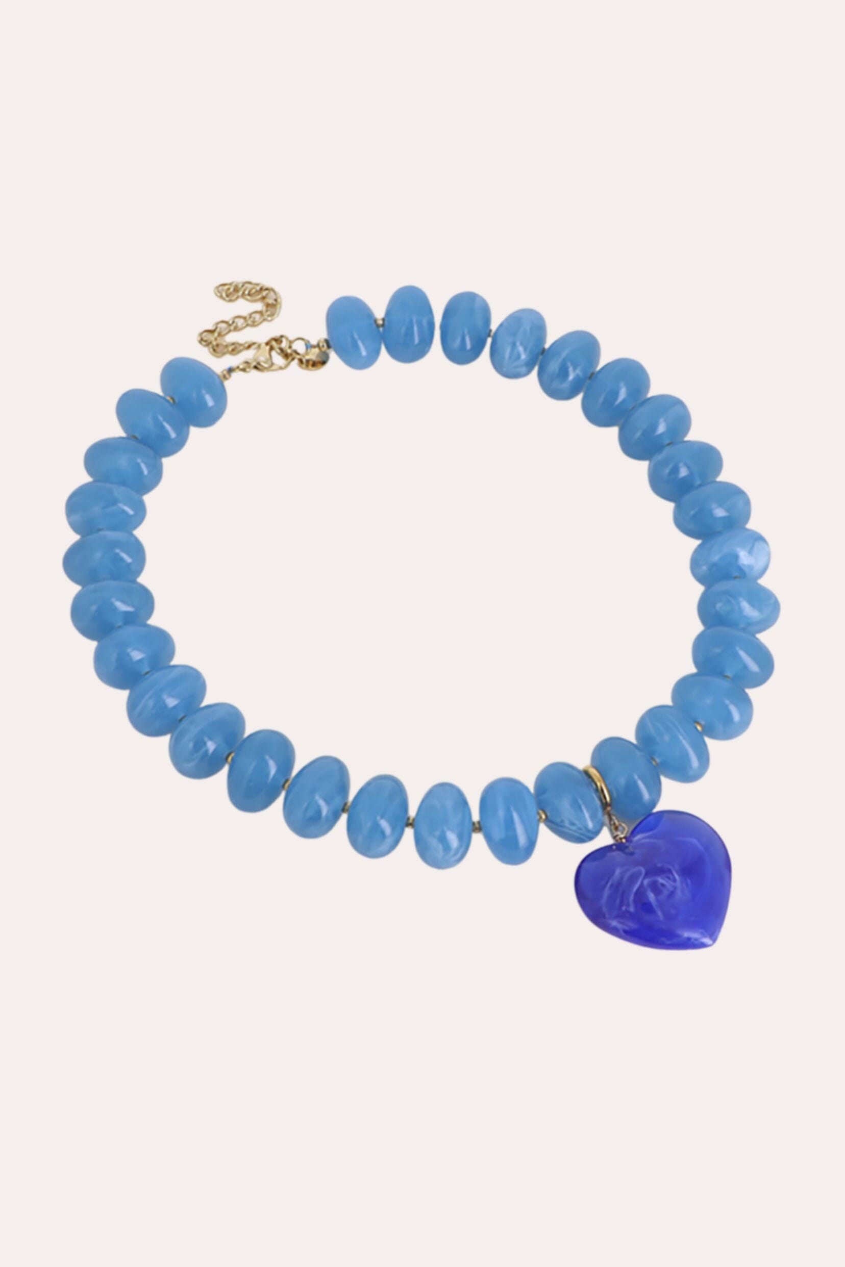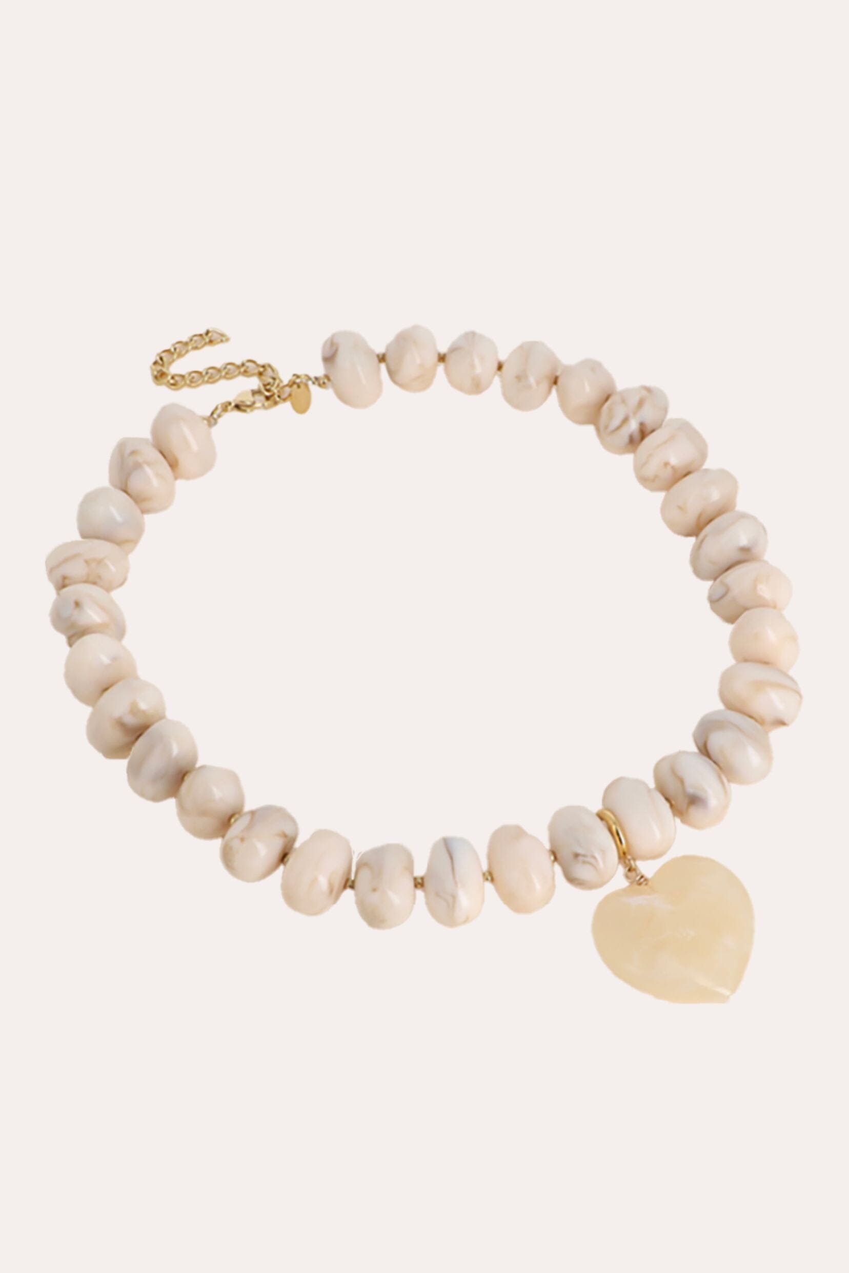 Collier sur cordon composé de grosses perles en résine colorée et d'un pendentif amovible en forme de coeur en résine.